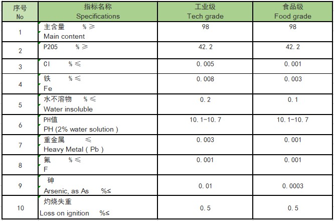 Property:white powder or mass, specific gravity: 2.534, M.P.: 1109 ; Soluble in water, insoluble in ethanol and its aqueous solution is alkali. Solubility(25 ): 187g/100g water; PH (1% aqueous solution): 10.2; It has the same properties as other condensed phosphate.