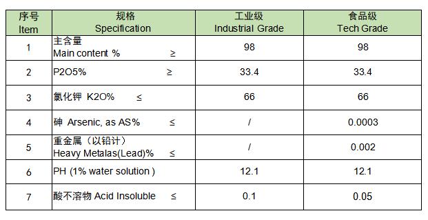 Property:White powder, easily soluble in water but insoluble in ethanol; Density at 2.45g/cm³ and melting point at 890℃; Deliquescent in the open air. The water solution shows weak alkalinity and stable at 70℃, but will be hydrolyzed into disodium phosphate when boiled.